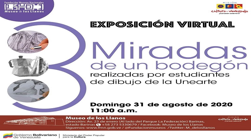 El próximo 31 agosto, el Museo de los Llanos (Mulla), ente adscrito al Ministerio del Poder Popular para la Cultura a través de la Fundación Museos Nacionales, presentará su tercera exposición virtual desde que inició la cuarentena social debido a la COVID-19, la cual llevará por nombre “Tres Miradas” y mostrará el trabajo de los tres mejores estudiantes de Dibujo Analítico I de la Universidad Nacional Experimental de las Artes (Unearte) Barinas.
