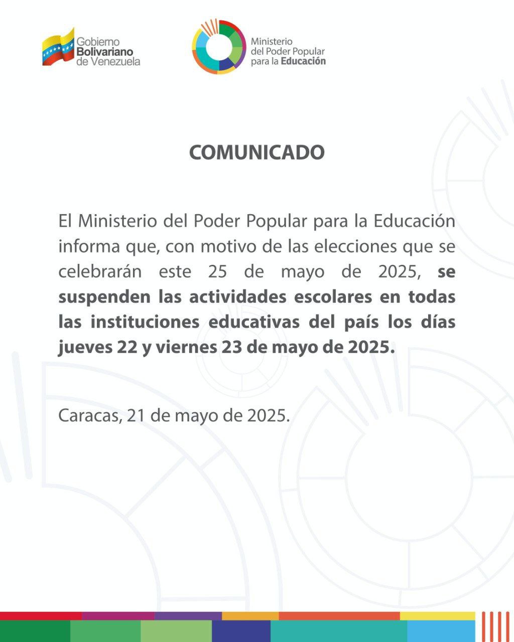 Las actividades escolares permanecerán suspendidas durante los días 22 y 23 de mayo en todas las instituciones educativas del territorio venezolano, de antesala a las elecciones pautadas para el domingo 25 de mayo. El Ministerio del Poder Popular para la Educación anunció esta medida mediante un comunicado oficial.