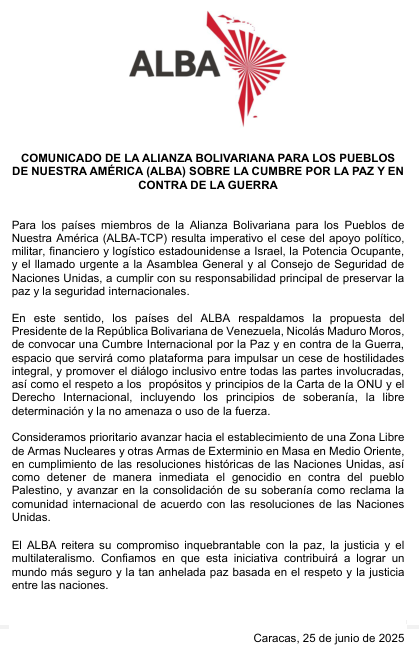 La Alianza Bolivariana para los Pueblos de Nuestra América (ALBA-TCP) publicó un comunicado en el cual solicita el cese total del apoyo político, militar, financiero y logístico por parte de Estados Unidos al Estado de Israel; además de solicitar urgentemente a la Asamblea General y al Consejo de Seguridad de las Naciones Unidas a cumplir efectivamente sus funciones como garante de la paz y la seguridad de Asia occidental y el mundo.
