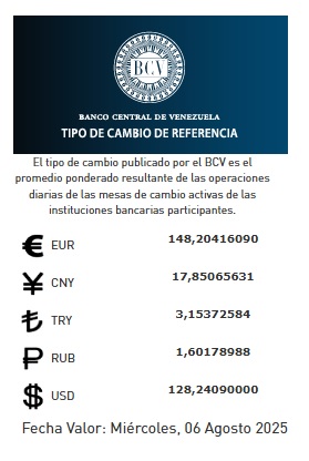 Vale destacar que el tipo de cambio publicado por el BCV es el promedio ponderado de las operaciones de las instituciones bancarias del país, al cierre de la jornada del martes 05 de agosto de 2025.