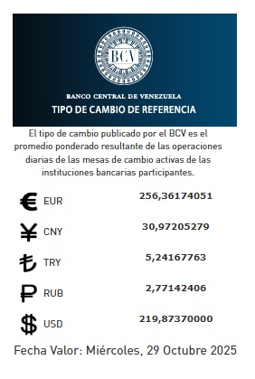 Vale destacar que el tipo de cambio publicado por el BCV es el promedio ponderado de las operaciones de las instituciones bancarias del país, al cierre de la jornada del martes 28 de octubre de 2025.