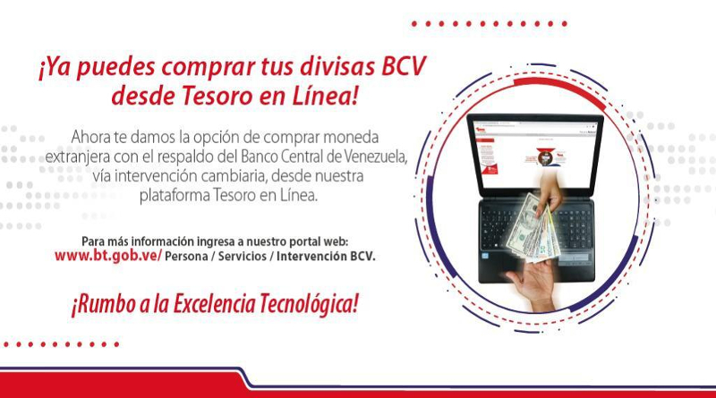 Los clientes del Banco del Tesoro pueden comprar dólares o euros, electrónicos y en efectivo, a través de la página www.bt.gob.ve, reseña nota de prensa de la entidad bancaria nacional. Para la compra, se brindan dos modalidades: por intervención del Banco Central de Venezuela (BCV), o directamente al Banco del Tesoro con el servicio Menudeo Plus, Compra de Divisas al Banco.