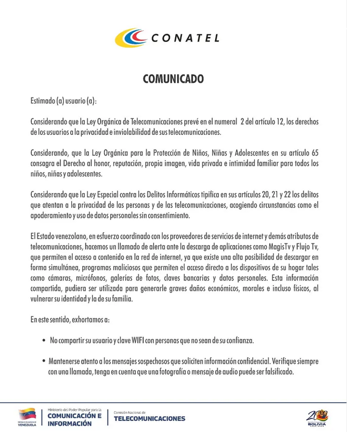 La Comisión Nacional de Telecomunicaciones (Conatel), en ejercicio de sus atribuciones y en estricto cumplimiento del marco legal venezolano, emitió una alerta para prevenir a los usuarios sobre los graves riesgos asociados a la descarga y uso de aplicaciones no certificadas que ofrecen acceso a contenidos multimedia, tales como MagisTV y Flujo TV.