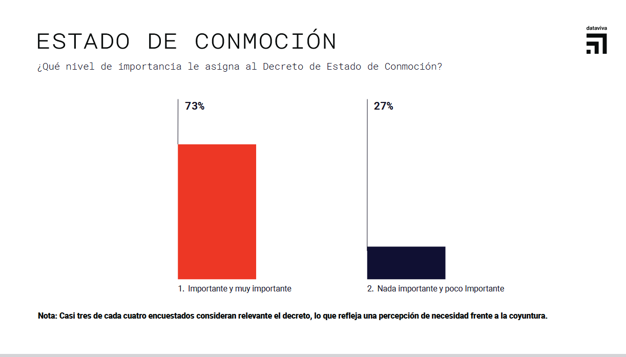 En cuanto al Decreto de Estado de Conmoción, el 73% lo considera importante o muy importante, lo que refleja sensibilidad ciudadana ante la coyuntura y el respaldo a la adopción de medidas extraordinarias en defensa de la estabilidad nacional.