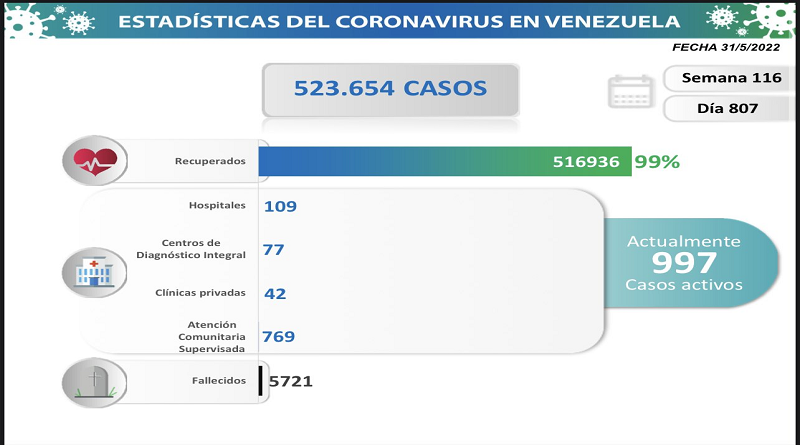 Un total de 28 casos de contagios de la COVID-19 por transmisión comunitaria y un caso importado, fueron detectados en las últimas 24 horas, elevando a 523 mil 654 el acumulado confirmado, 997 casos activos, mientras que la cifra de recuperados se ubica en 516 mil 936 pacientes sanados, gracias a los tratamientos gratuitos que garantiza el Gobierno Bolivariano.