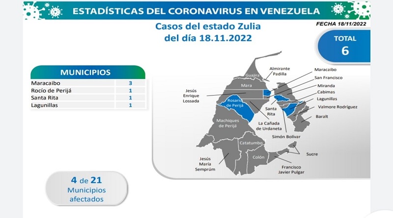Zulia presenta hoy el mayor número de contagios en cuatro de sus 21 municipios: Maracaibo 3, Rocío de Perijá 1, Santa Rita 1 y Lagunillas 1.