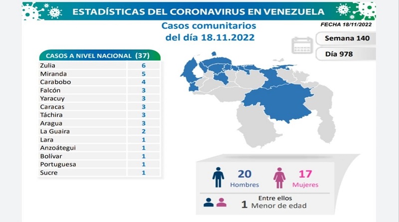 Informó que los 96 casos comunitarios están ubicados en: Zulia 6, Miranda 5, Carabobo 4, Falcón 3, Yaracuy 3, entre otros que se muestran en la siguiente lámina: