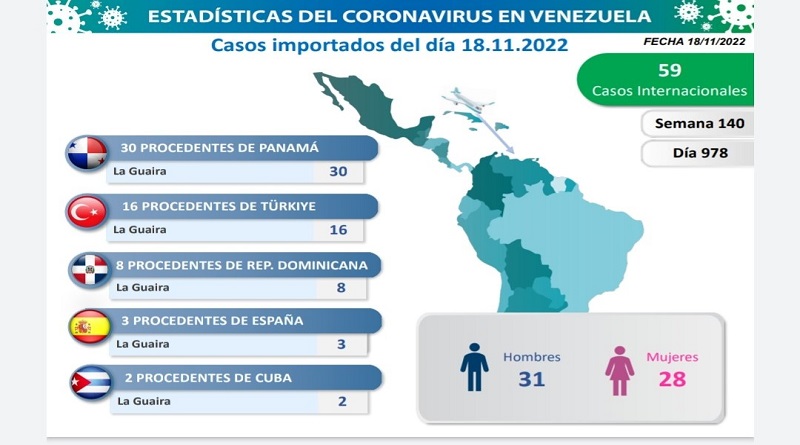 De los 59 casos importados, ocho vienen desde República Dominicana, tres desde España, 30 desde Panamá, 16 desde Türkiye y dos de Cuba, todos con entrada por La Guaira