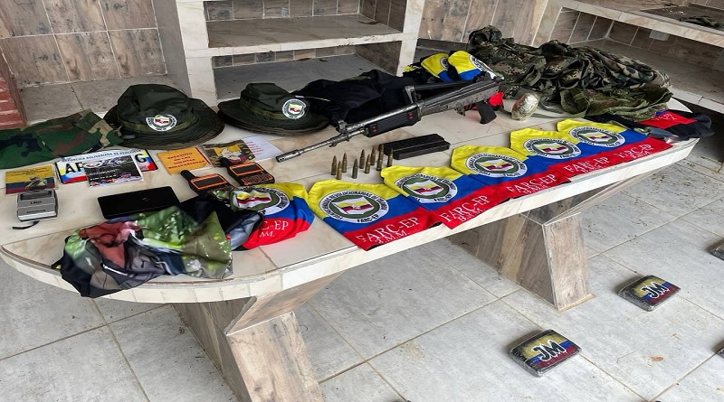 El decomiso incluyó cinco bufandas y 14 franelas con insignias de la FARC-EP, así como cinco (05) cartillas de Estatutos de dicha organización.