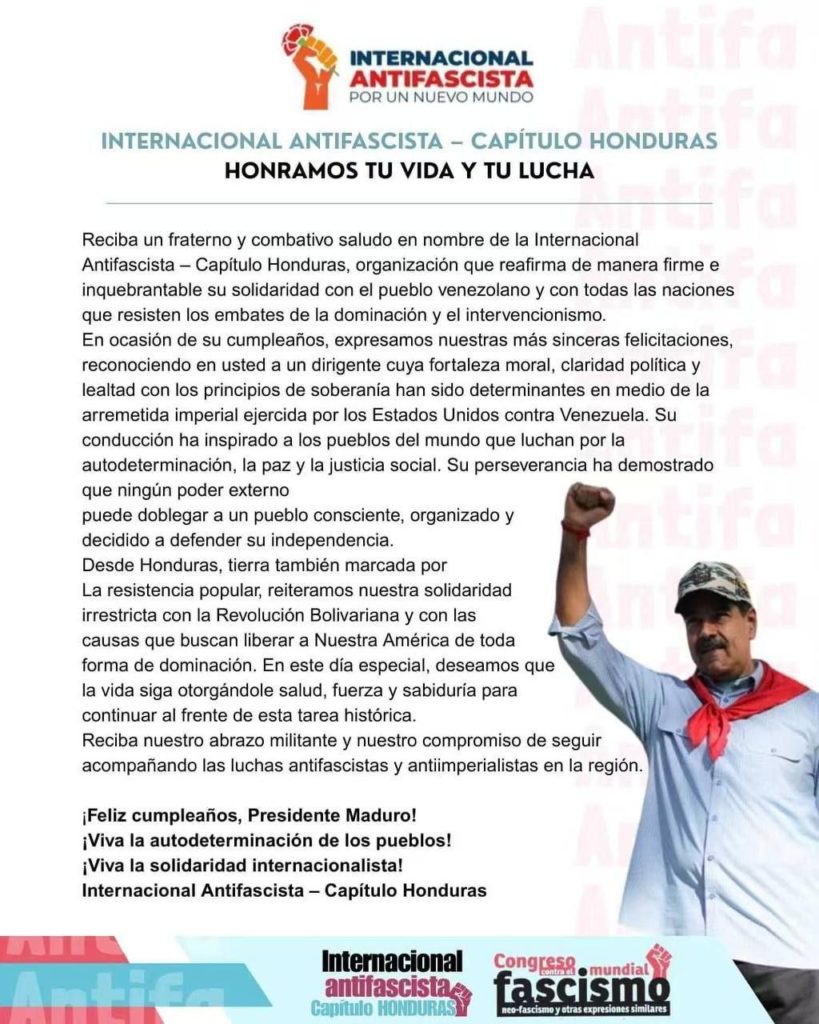 La Internacional Antifascista, capítulo Honduras, envió un saludo al presidente de la República Bolivariana de Venezuela, Nicolás Maduro, con motivo de su cumpleaños, reafirmó su respaldo a la soberanía nacional y a la lucha antiimperialista.