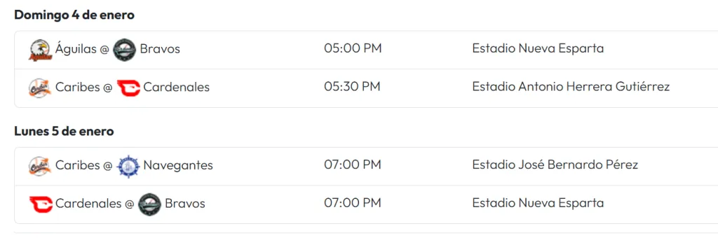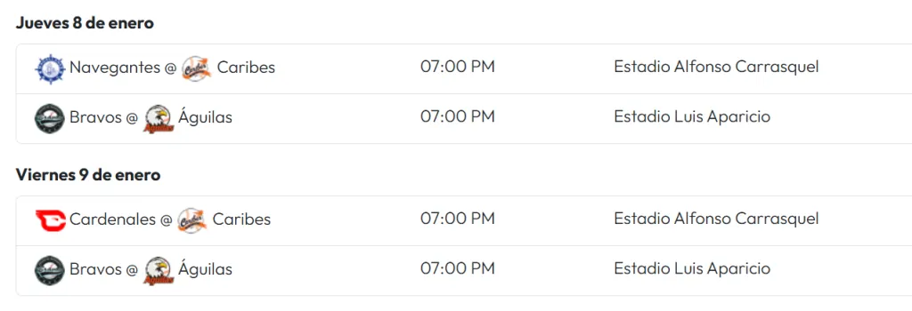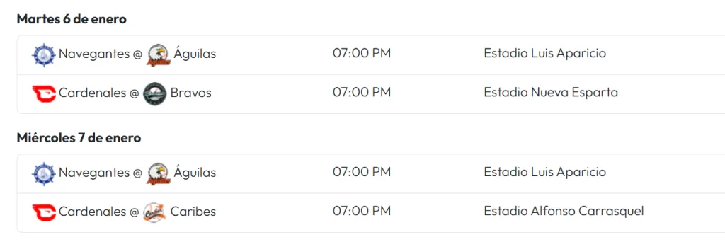 El actual campeón y mejor récord de la ronda, Cardenales de Lara, debutará en Barquisimeto el viernes frente a Caribes de Anzoátegui, mientras que las Águilas del Zulia visitarán Valencia para medirse a Navegantes del Magallanes.