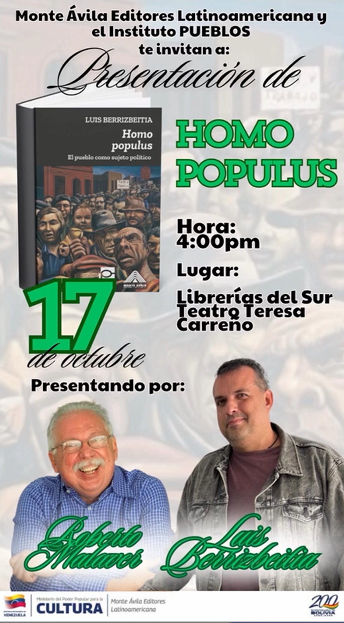 El viernes 17 de octubre, en los espacios de la Librería del Sur del Teatro Teresa Carreño, en Caracas, se realizará la presentación del libro “Homo populus”, obra del profesor Luis Berrizbeitia.