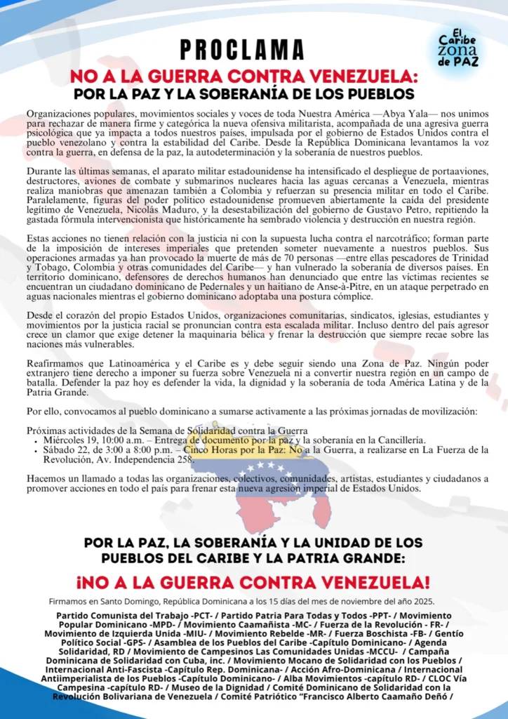 El movimiento concluyó reafirmando que Latinoamérica y el Caribe «es y debe seguir siendo una Zona de Paz». Ante la escalada, las organizaciones convocaron al pueblo dominicano a sumarse a las próximas jornadas de movilización, que incluirán una entrega de documento por la paz en la Cancillería el miércoles y un evento cultural de «Cinco Horas por la Paz» el próximo sábado.