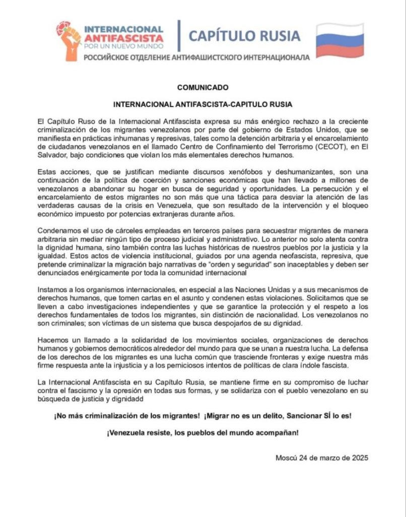 Mientras, la Internacional Antifascista capítulo El Cairo denunció con indignación la colaboración criminal entre los gobiernos de EE. UU. y El Salvador “en la que cazan migrantes venezolanos como mercancía para traficarlos. Ellos imponen sanciones criminales que buscan asfixiar a nuestro pueblo y promover la migración, es la doble moral imperial”.