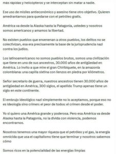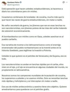 ​Petro descalificó la acción militar, y comparó el uso de misiles contra una lancha en el Caribe con los bombardeos en Gaza y calificándolo como un «asesinato» por la ruptura del principio de proporcionalidad jurídica.