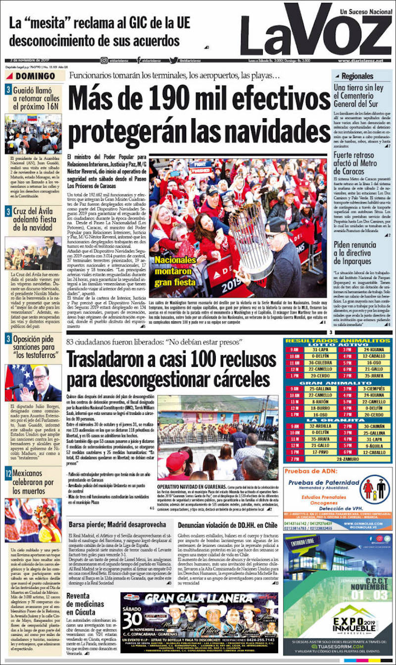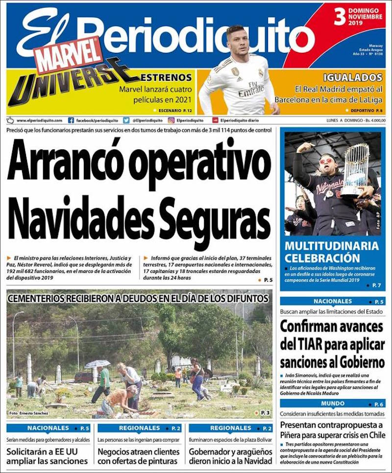 El despliegue del Dispositivo de Seguridad Navidades Seguras 2019 ocupa los principales titulares de la prensa escrita venezolana este domingo 03 de noviembre de 2019.