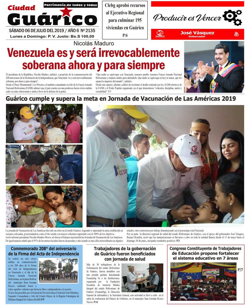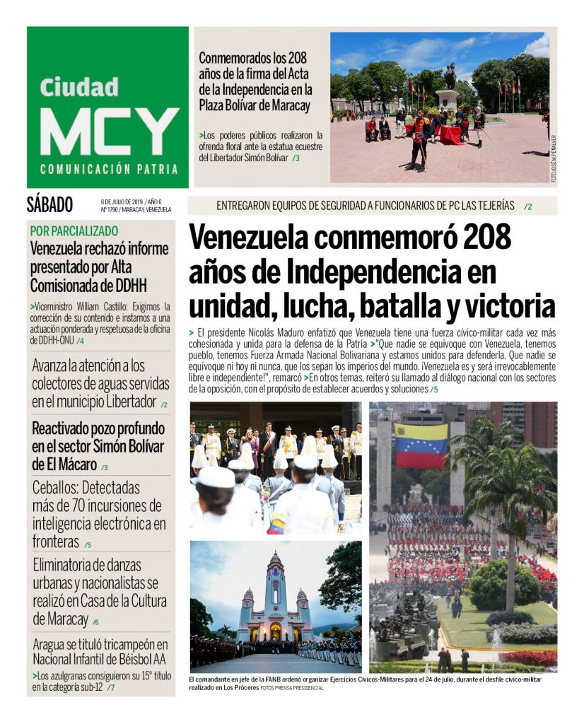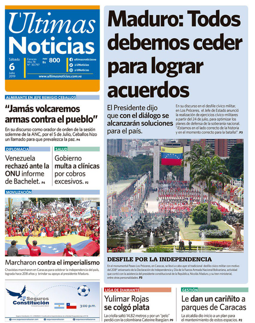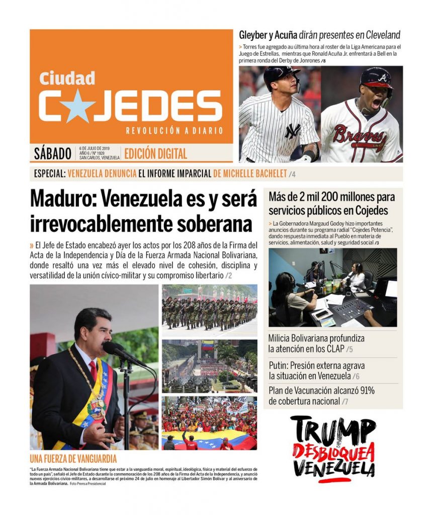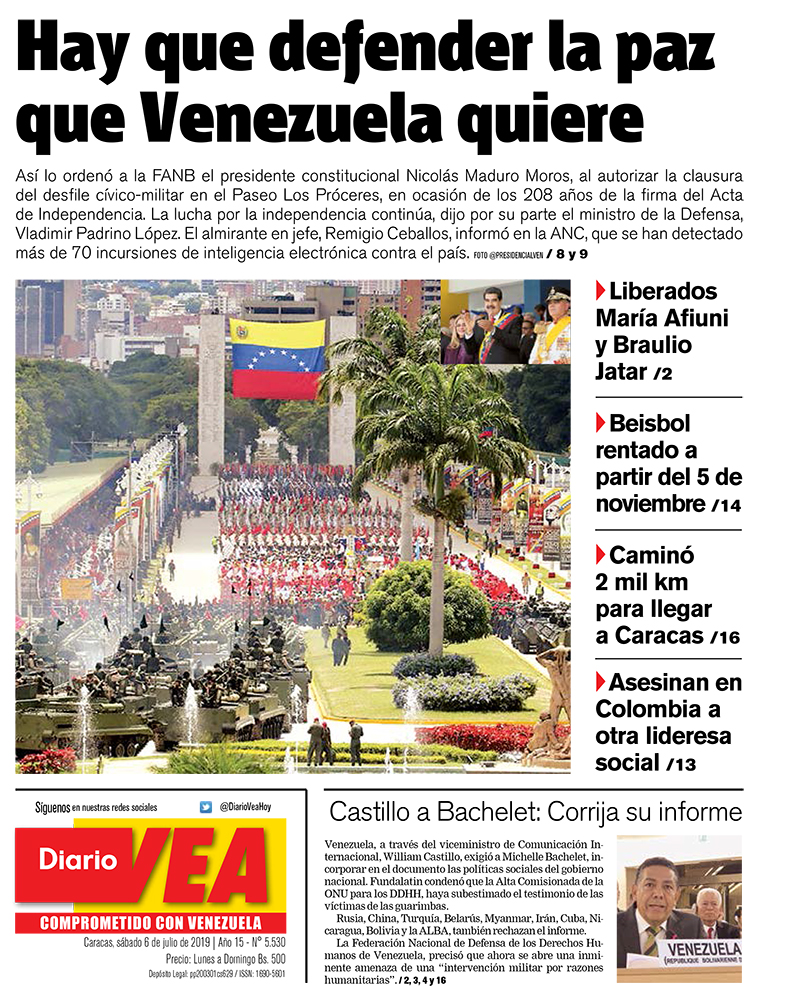 En las portadas de los medios impresos y digitales que circulan este sábado 06 de julio, aparecen titulares relacionados con la solicitud de Venezuela a la Alta Comisionada de las Naciones Unidas para los Derechos Humanos, Michelle Bachelet, de corregir su infome en torno a la situación de los DDHH en el país. Asimismo, reseñan del discurso e instrucciones del mandatario venezolno durante el desfile cívico militar con motivo a los 208 años de la firma del Acta de la Independencia de Venezuela.