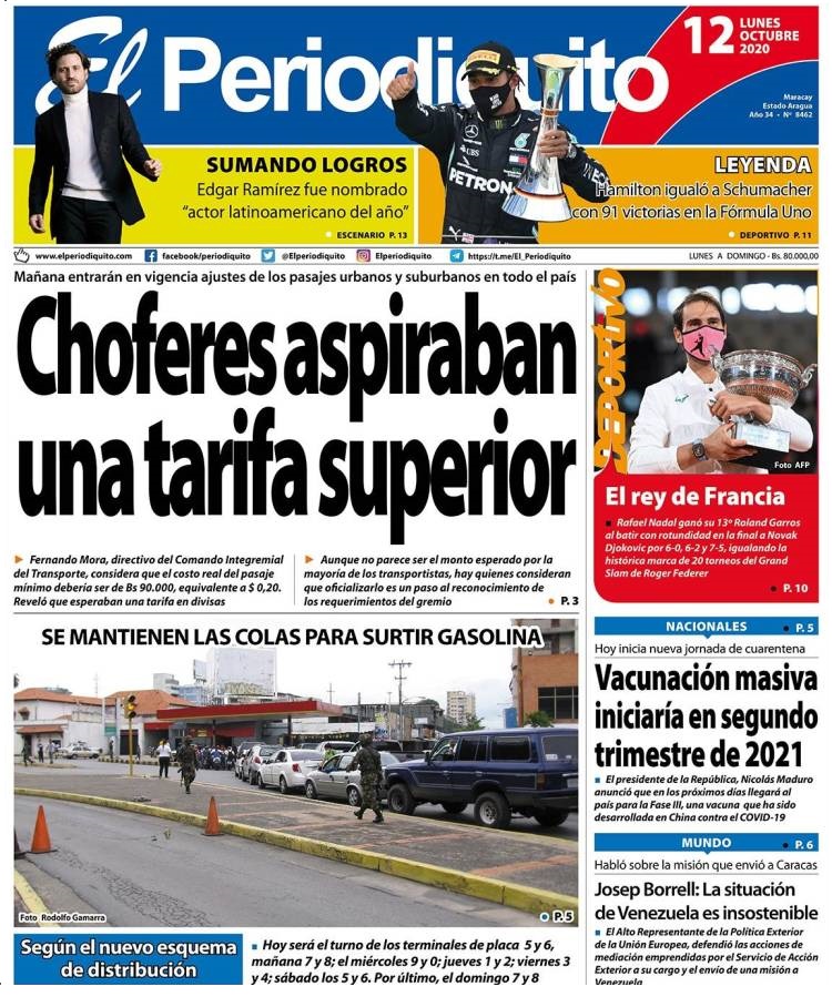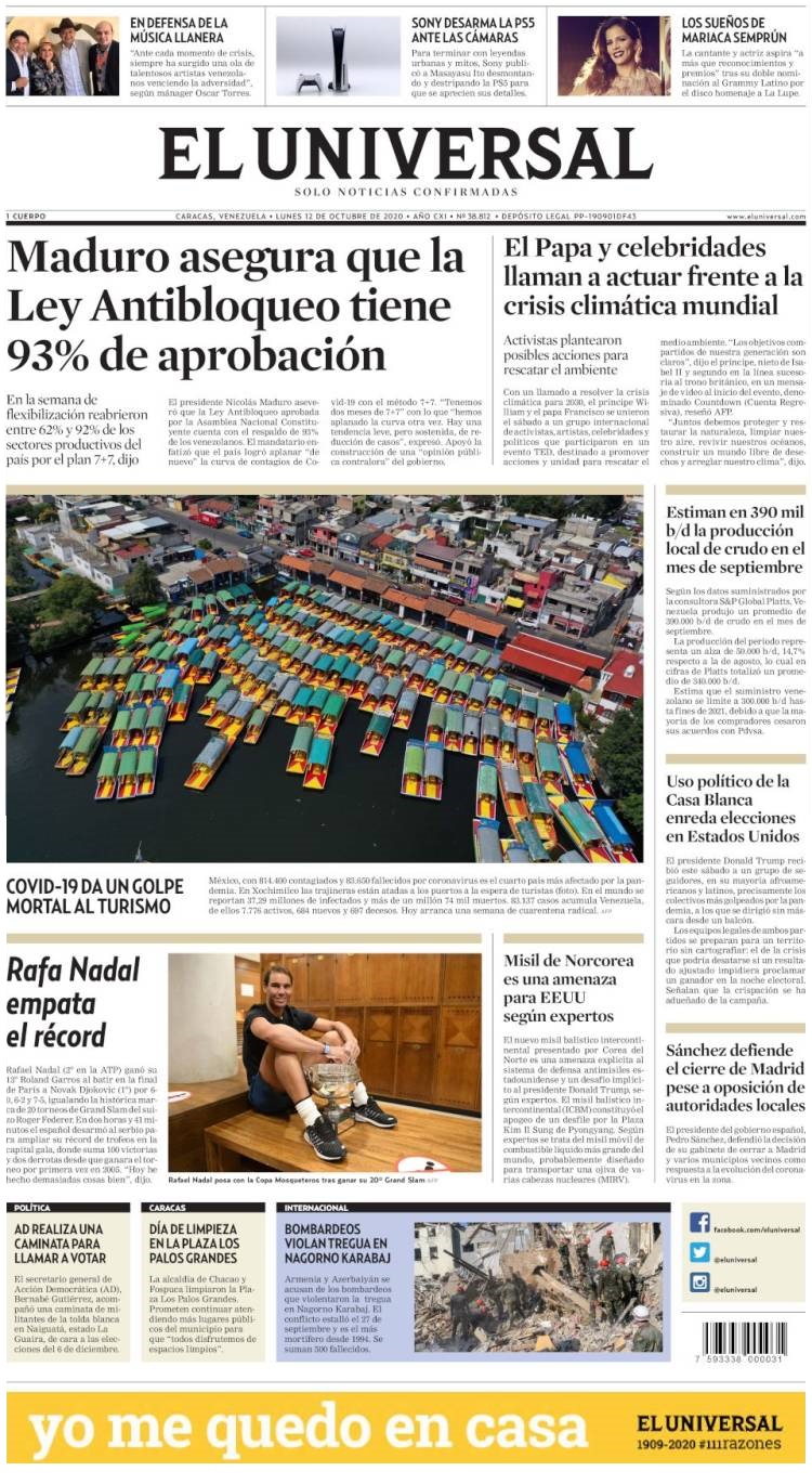 Lea aquí los titulares reflejados en las portadas de los medios impresos y digitales que circulan en Venezuela este lunes 12 de octubre de 2020.