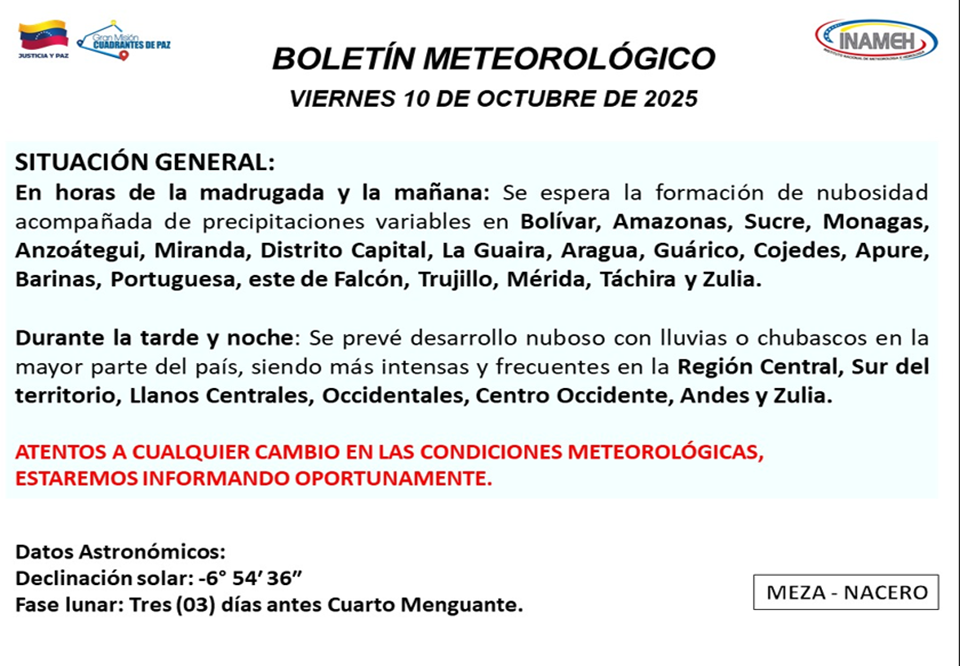De igual forma, el Inameh señala que durante la tarde y noche se estima desarrollo nuboso con lluvias o chubascos en la mayor parte del país, al ser más intensas y frecuentes en la Región Central, Sur del territorio, Llanos Centrales, Occidentales, Centro Occidente, Andes y Zulia.