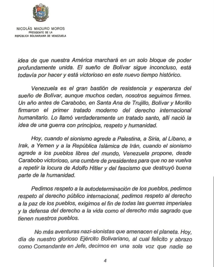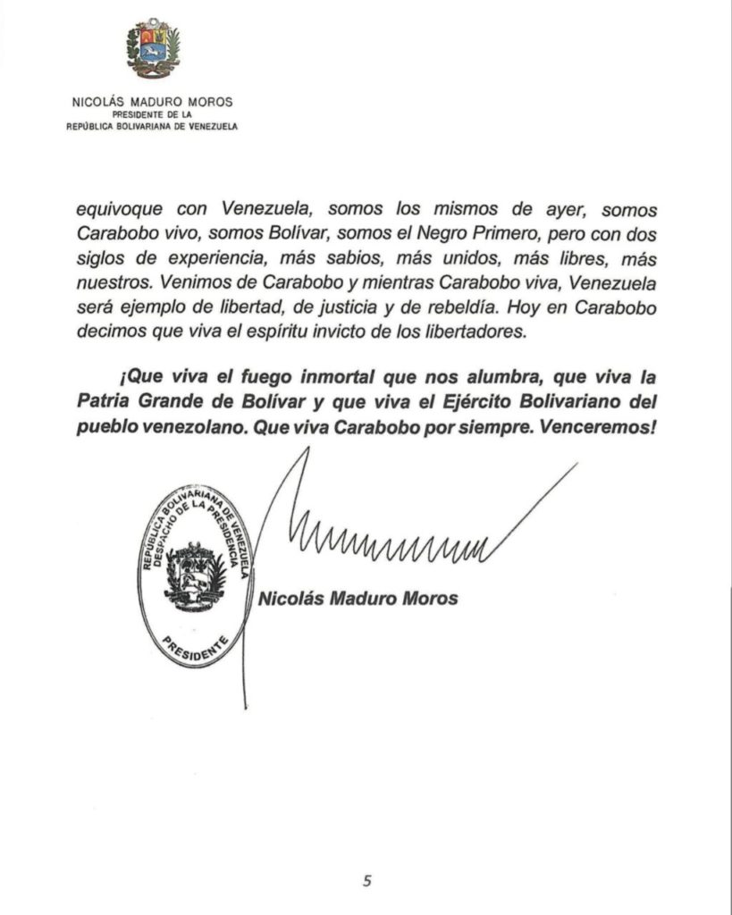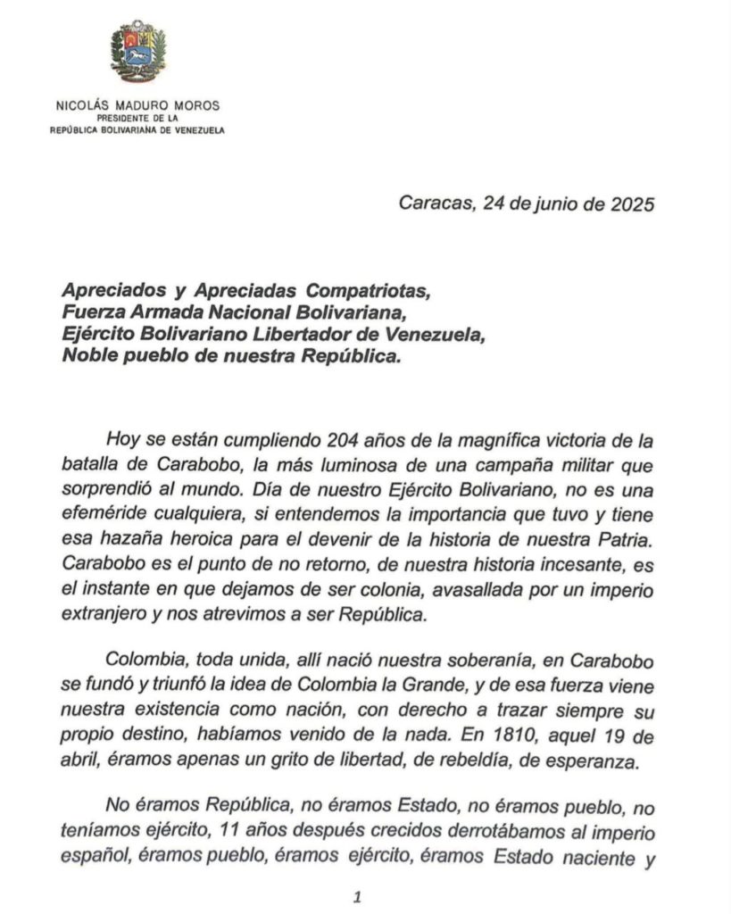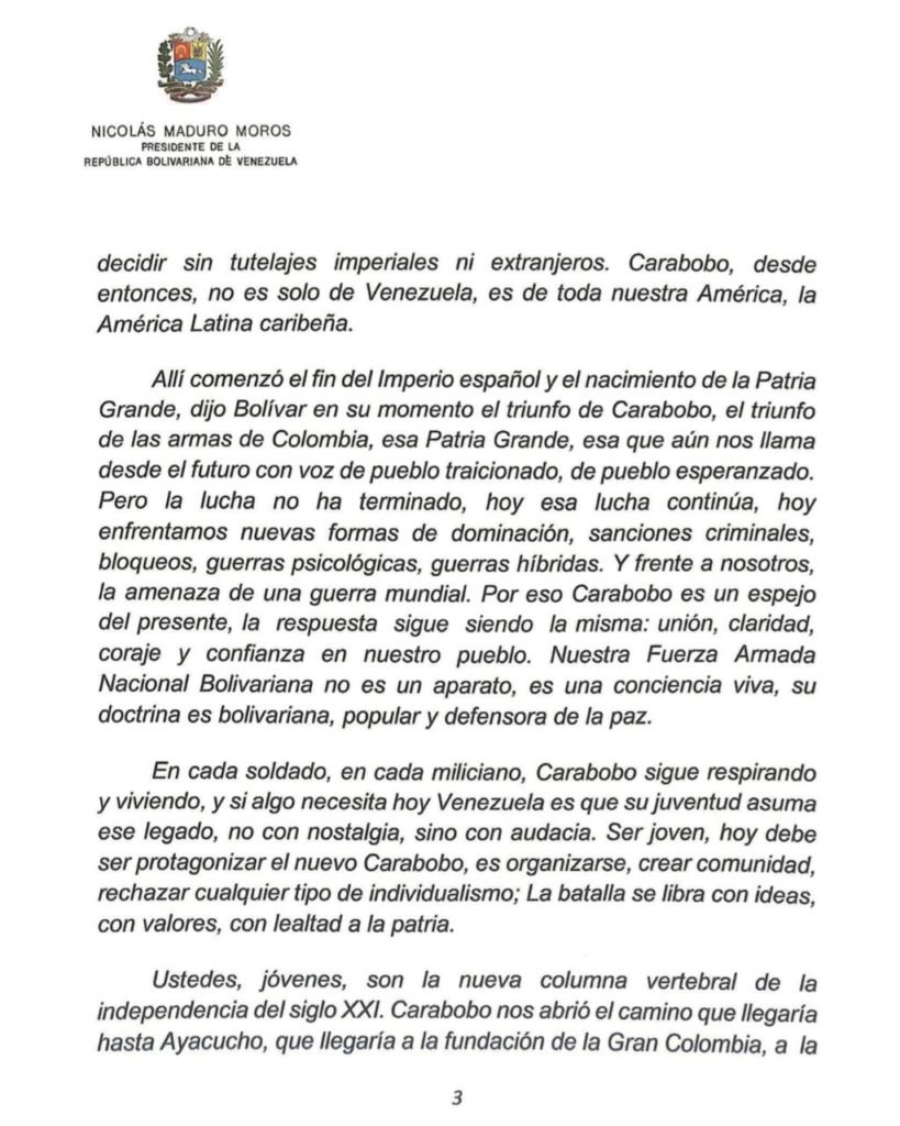 “Apreciados y apreciadas compatriotas, gloriosa Fuerza Armada Nacional Bolivariana, hoy se están cumpliendo 204 años de la magnífica victoria de la Batalla de Carabobo (…). Allí nació nuestra patria soberana”, expresó el presidente de la República Bolivariana de Venezuela, Nicolás Maduro, al conmemorar el 204° aniversario de esta gesta histórica y el Día del Ejército Bolivariano.