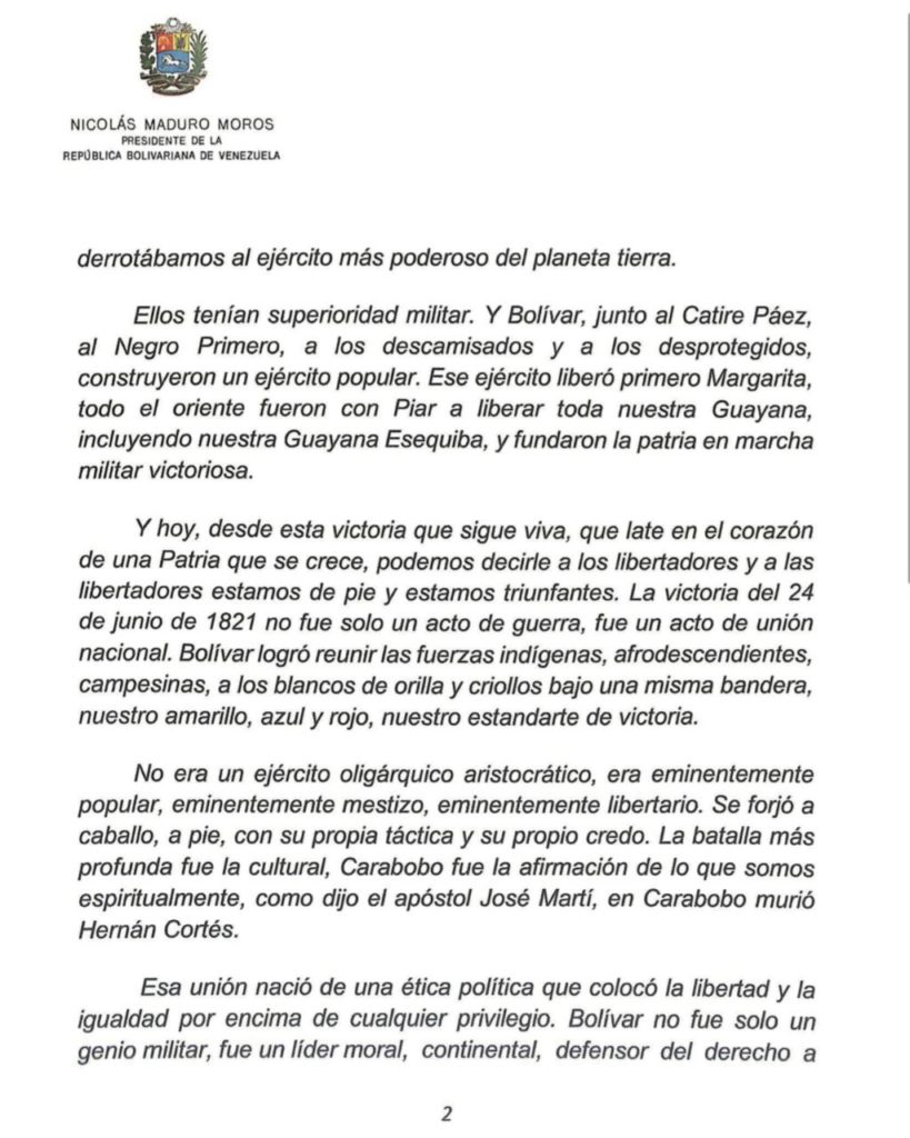 Durante su alocución, subrayó el carácter integrador del ejército patriota liderado por Simón Bolívar, constituido por pueblos originarios, afrodescendientes y campesinos. En este sentido, resaltó que “la victoria del 24 de junio de 1821 no fue solo un acto de guerra, fue un acto de unidad nacional”.