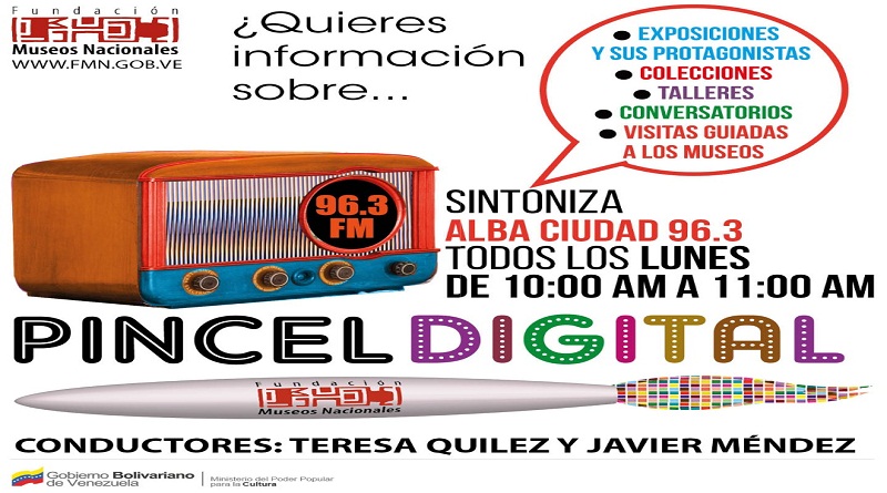 La Fundación Museos Nacionales (FMN), anuncia el relanzamiento del programa radial “Pincel Digital”, el lunes 21 de marzo, a las 10:00 am., a través de la emisora Alba Ciudad 96.3 FM.