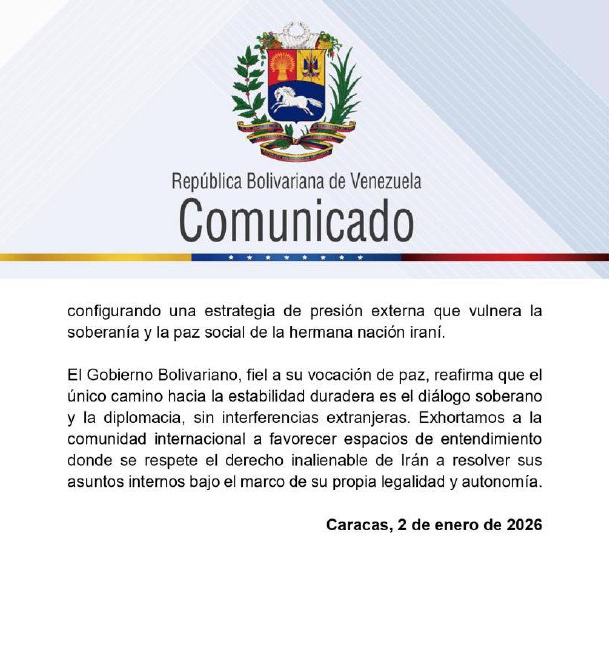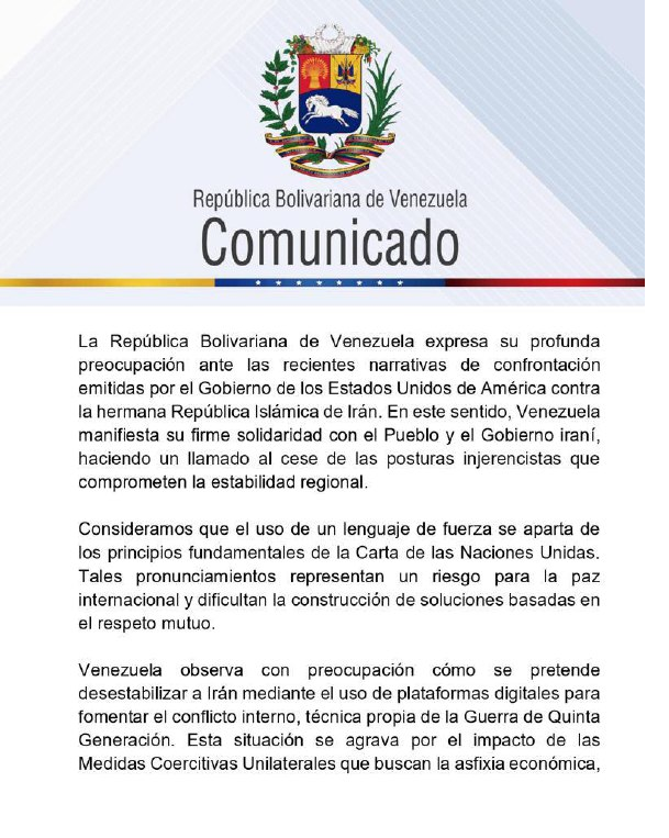 El Gobierno de la República Bolivariana de Venezuela manifestó su solidaridad con el Pueblo y Gobierno de la República Islámica de Irán, en respuesta a las narrativas de confrontación recientemente emitidas por la Administración de Donald Trump en Estados Unidos (EE. UU.) contra la nación persa.