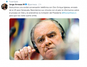 El canciller de la República Bolivariana de Venezuela, Jorge Arreaza, informó que sostuvo una conversación con el enviado de la Unión Europea para Venezuela, Enrique Iglesias, a quien extendió invitación del presidente Nicolás Maduro para visitar el país.