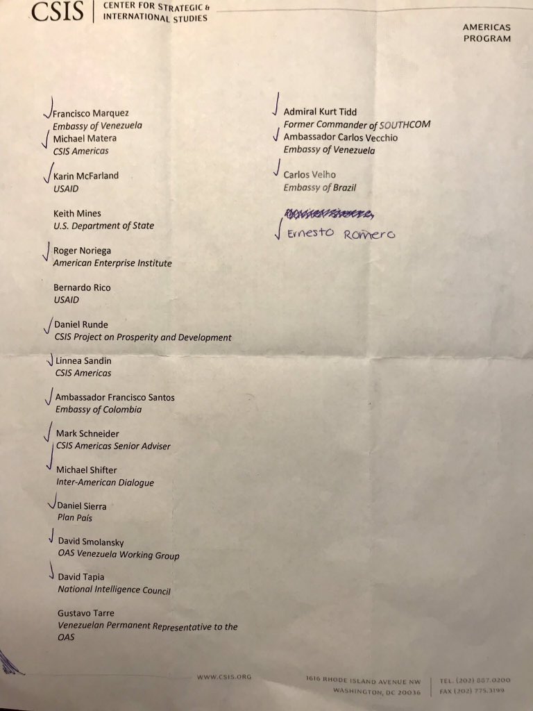 Entre los participantes también figuran el exembajador de EE.UU. en Venezuela, William Brownfield; el embajador de Colombia en EE.UU, Francisco Santos, el exsubsecretario de Estado para Asuntos del Hemisferio Occidental de EE.UU., Roger Noriega y funcionarios enviados por Guaidó como Carlos Vecchio, Gustavo Tarre y David Smolansky.
