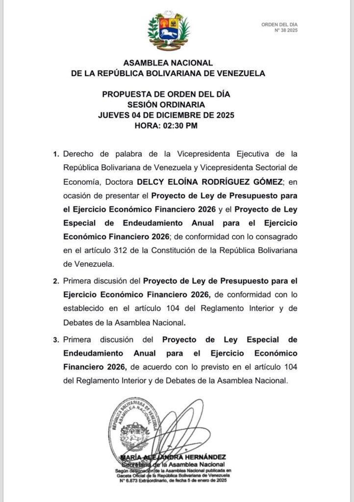 Durante la sesión plenaria de este 04-Dic, la Asamblea Nacional (AN) tendrá en el orden del día la presentación y discusión del Proyecto de Ley de Presupuesto para el Ejercicio Económico Financiero 2026 y el Proyecto de Ley Especial de Endeudamiento Anual para el Ejercicio Económico y Financiero 2026, de acuerdo con la normativa del Parlamento. La sesión está pautada para las 2:30 p.m.